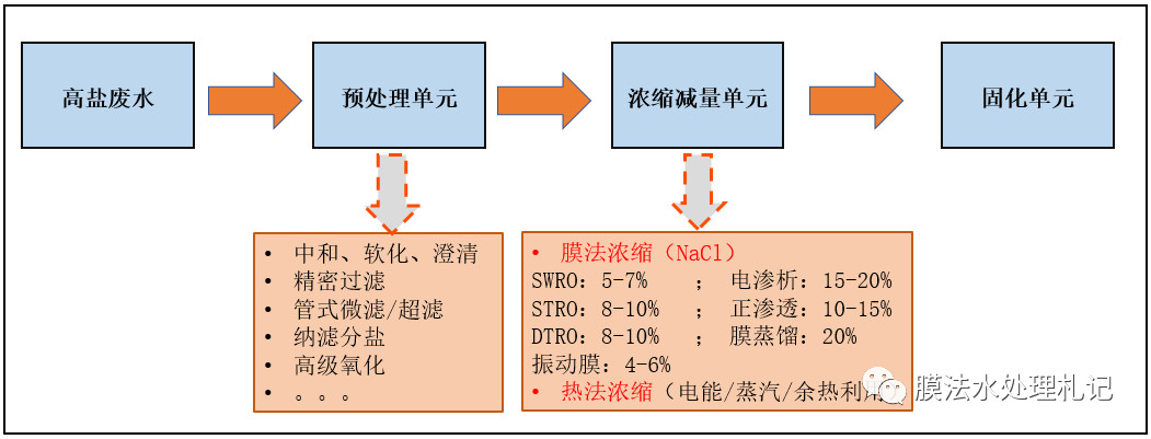 這些年零排放組合工藝越來越成熟,盡管可選的配套工藝繁多,但是總結歸納下來,末端高鹽廢水處理系統(tǒng)主要含以下幾個單元: