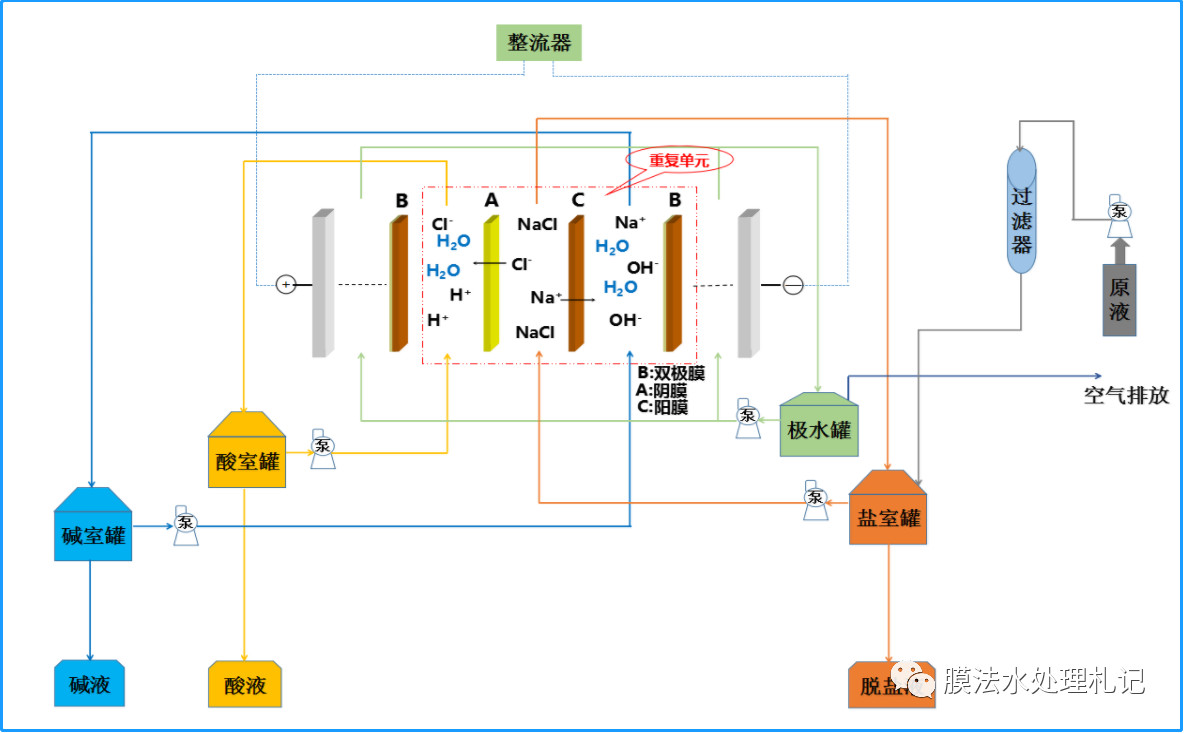 雙極膜電滲析的系統(tǒng)相對簡單,系統(tǒng)能耗主要由整流器、動設備組成。以下是常規(guī)雙極膜系統(tǒng)簡易流程圖。