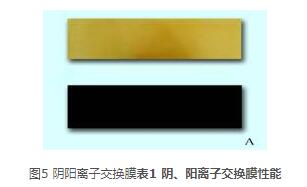陽(yáng)膜為苯乙烯系磺酸型均相陽(yáng)離子交換膜(JCM-Ⅱ)(圖5A下);陰膜為苯乙烯季銨型均相陰離子交換膜(JAM-Ⅱ) (圖5A上);我公司自主研發(fā)生產(chǎn)。在外加直流電場(chǎng)力的作用下,陰膜只讓陰離子通過(guò)而阻擋陽(yáng)離子,陽(yáng)膜只讓陽(yáng)離子通過(guò)而阻擋陰離子,它們具有耐強(qiáng)酸、強(qiáng)堿,柔韌度強(qiáng),機(jī)械強(qiáng)度高,使用壽命長(zhǎng)等特點(diǎn)。各膜性能指標(biāo)如下: