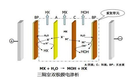 在直流電場中,利用雙極膜解離水成氫離子和氫氧根離子的特性及陰、陽離子交換膜分別對陰、陽離子選擇透過性,將鹽溶液轉化成酸和堿溶液。